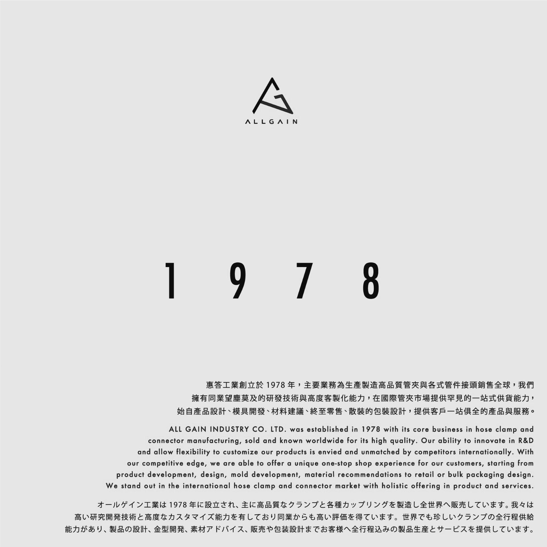 ALL GAIN INDUSTRY CO., LTD. was established in 1978 and specializes in the manufacture of high-quality hose clamps, connectors, and fittings. We offer a unique one-stop-shop experience, starting from product development, design, mold development, material recommendations, and retail or bilk packaging design.