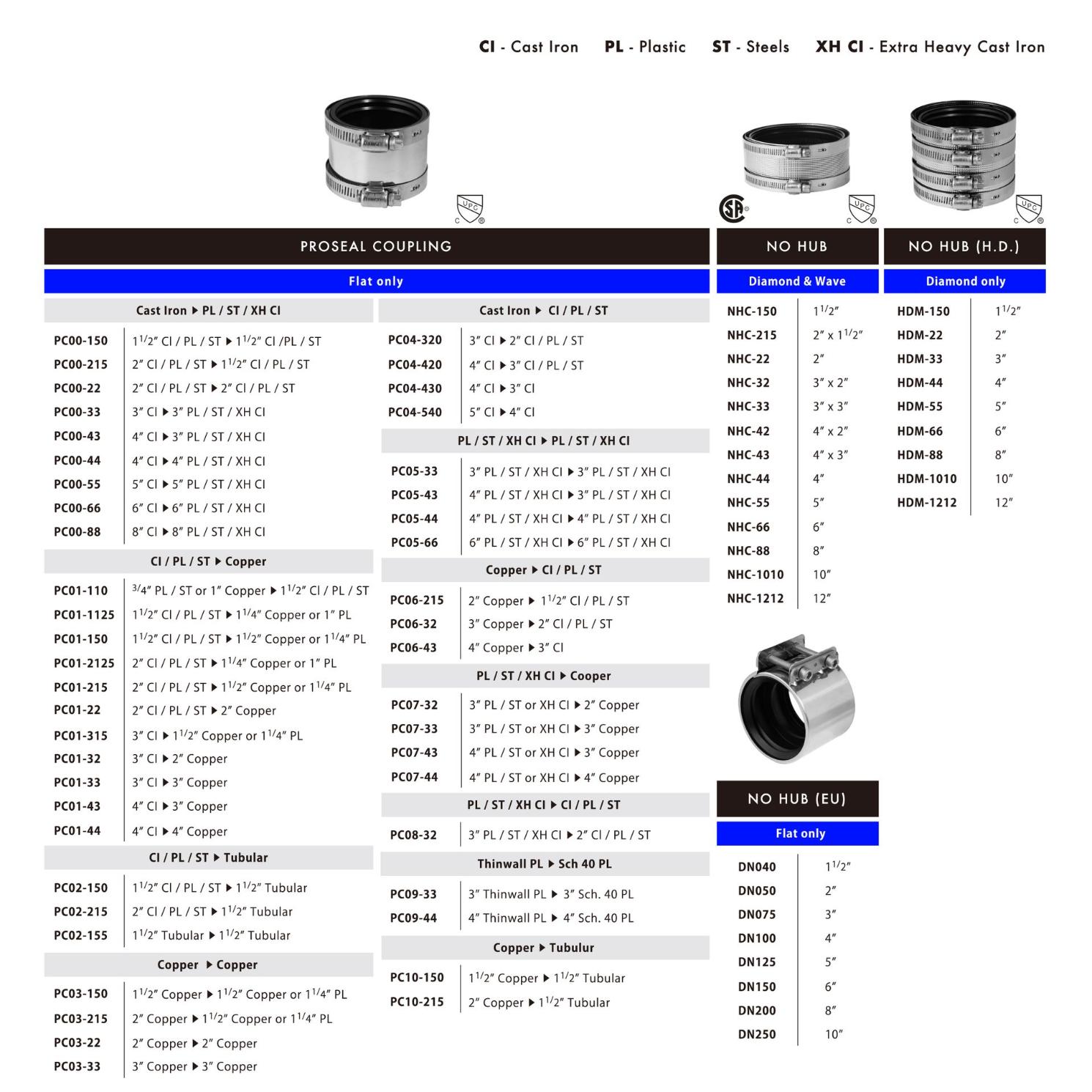 Our No-Hub Couplings are engineered to meet the latest ASTM C1277 requirements. Crafted with precision, they feature a protective shield, clamp housing, and clamp screw made from durable 304 series stainless steel, while the clamp band is constructed from robust 301 series stainless steel. The neoprene gaskets adhere to the stringent standards outlined in the latest ASTM C564 edition. Rest assured, our No-Hub Couplings proudly bear the UPC® certification, a testament to their quality and compliance.